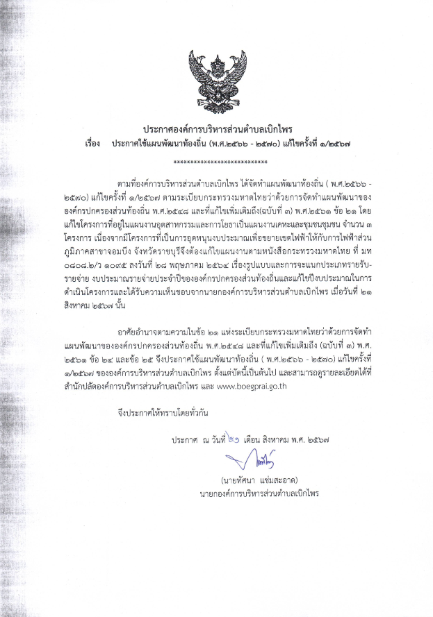 แผนพัฒนาท้องถิ่น(พ.ศ.๒๕๖๖-๒๕๗๐) แก้ไขครั้งที่ ๑/๒๕๖๗