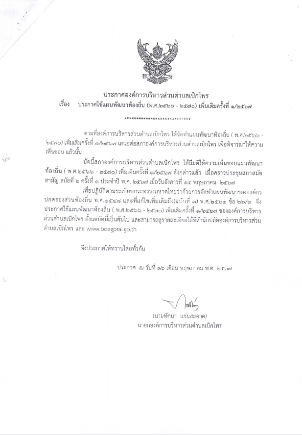 ประกาศใช้แผนพัฒนาท้องถิ่น (พ.ศ.๒๕๖๖ - ๒๕๗๐) เพิ่มเติม ครั้งที่ ๑/๒๕๖๗