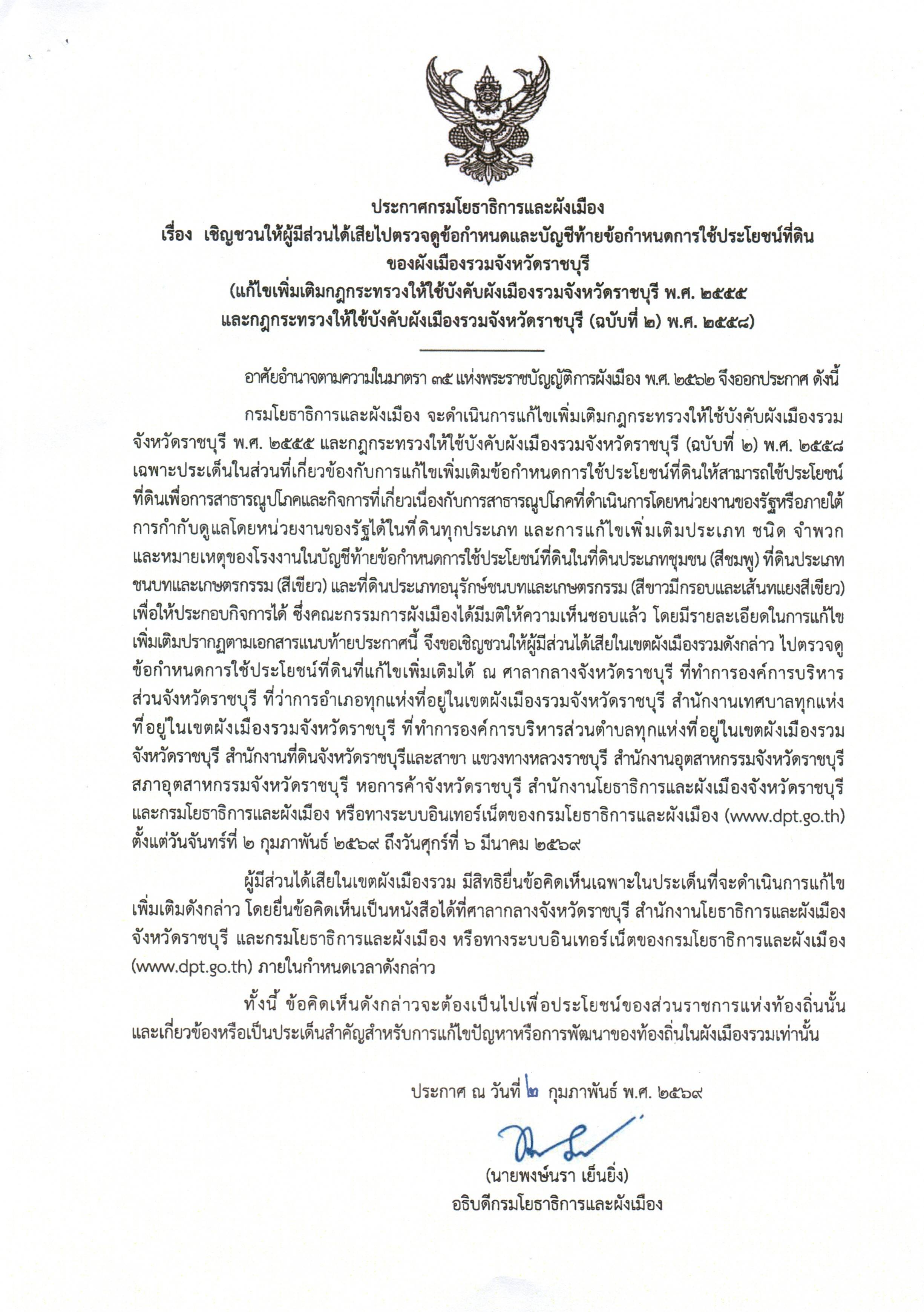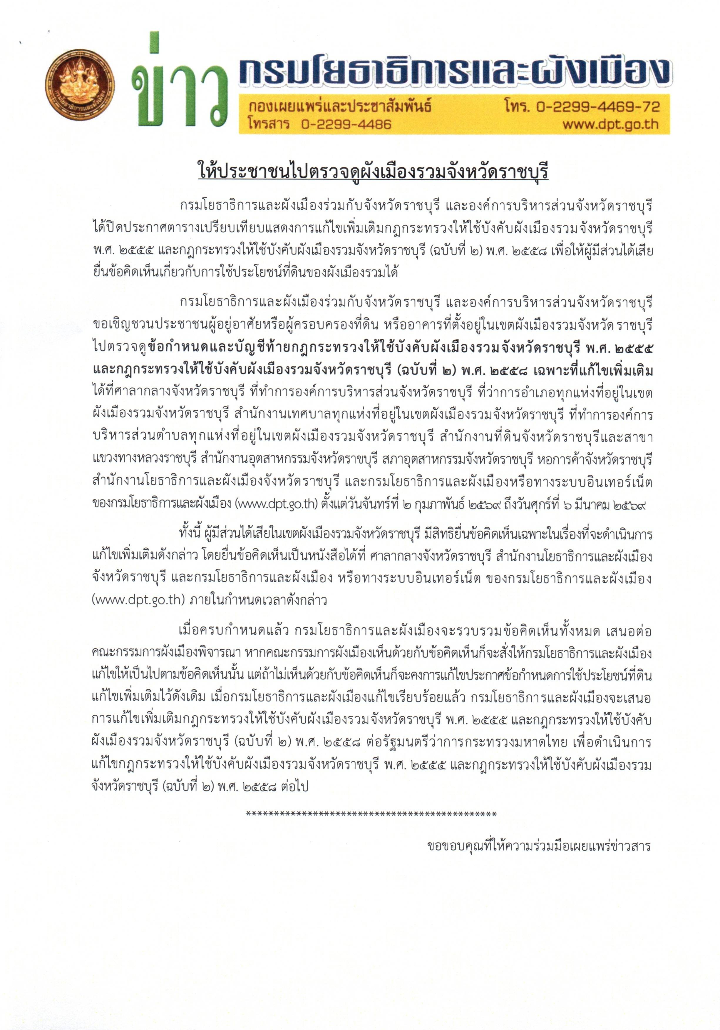 เรื่อง เชิญชวนให้ผู้มีส่วนได้เสียไปตรวจดูข้อกำหนดและบัญชีท้ายข้อกำหนดการใช้ประโยชน์ที่ดินของผังเมืองรวมจังหวัดราชบุรี