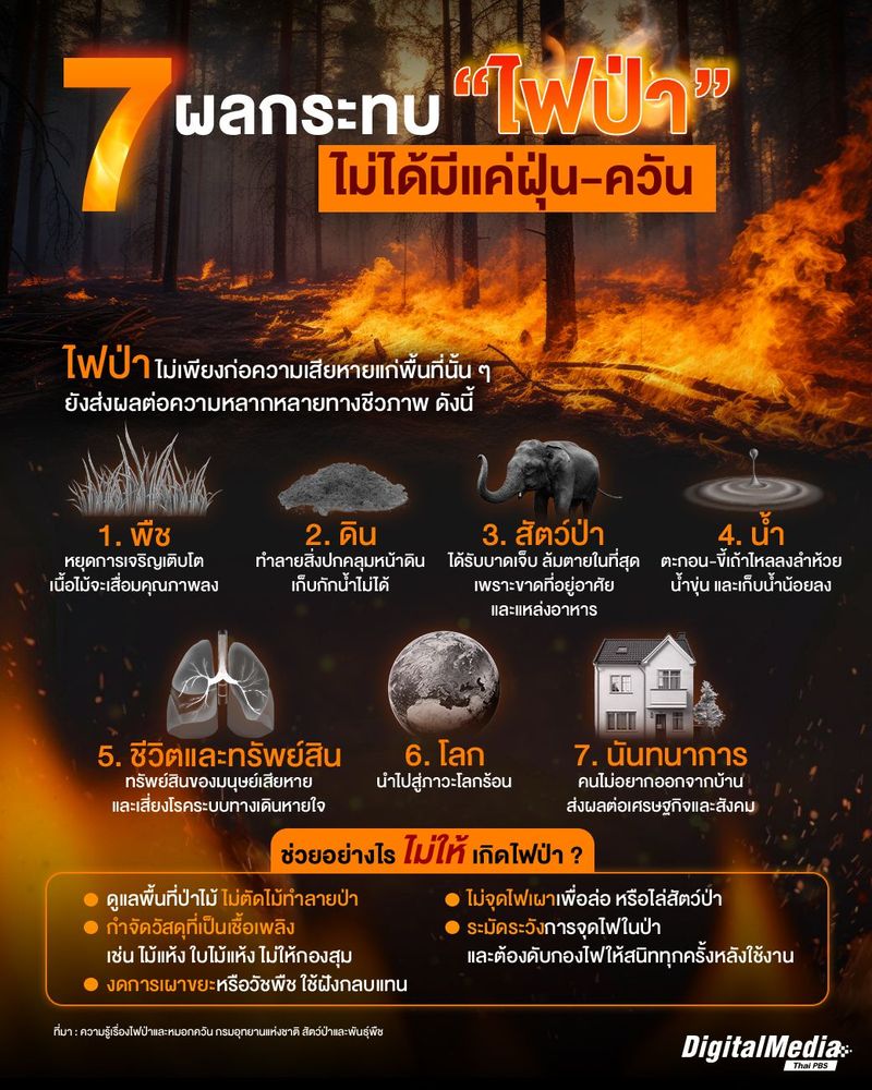 แหล่งข้อมูล : ความรู้เรื่องไฟป่าและหมอกควัน กรมอุทยานแห่งชาติ สัตว์ป่าและพันธุ์พืช