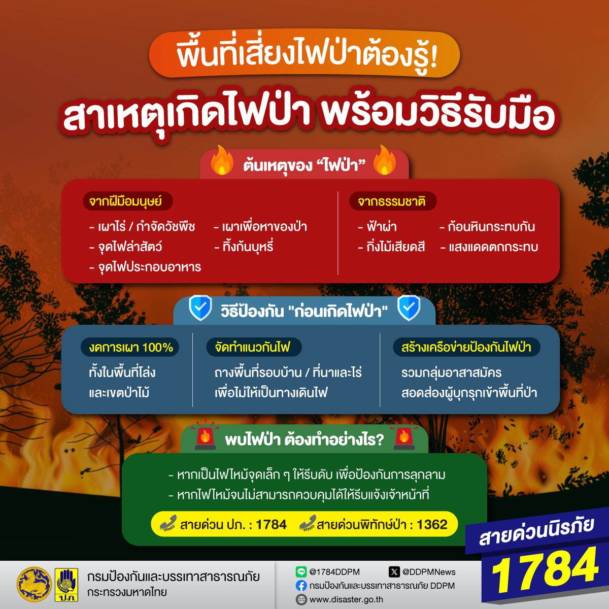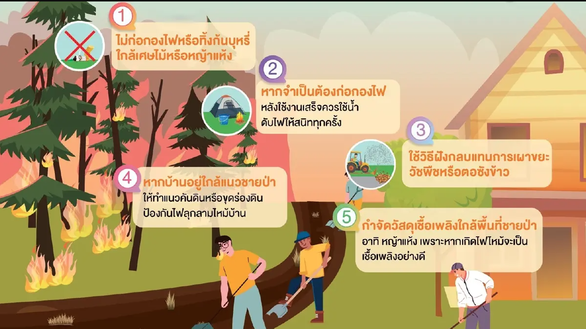 ทั้งนี้ หากพบเห็นเหตุเพลิงไหม้ หรือสถานการณ์ที่อาจก่อให้เกิดไฟป่า โปรดแจ้งหน่วยงานที่เกี่ยวข้องโดยด่วน เพื่อร่วมกันป้องกันและลดความเสียหายต่อชีวิต ทรัพย์สิน และทรัพยากรธรรมชาติของชุมชนเรา