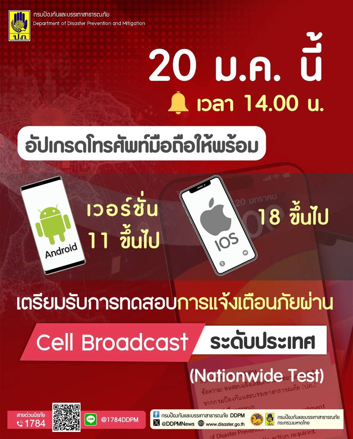 ด้วยกรมป้องกันและบรรเทาสาธารณภัย (ปภ.) กำหนดดำเนินการทดสอบระบบแจ้งเตือนภัยผ่านโทรศัพท์เคลื่อนที่ (Cell Broadcast) ในระดับประเทศ เพื่อเตรียมความพร้อมและเพิ่มประสิทธิภาพในการแจ้งเตือนประชาชนกรณีเกิดสาธารณภัย