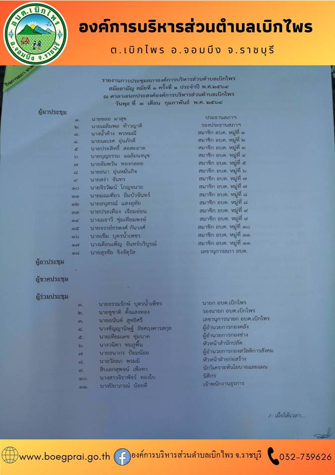 รายงานกาตรวจบันทึกรายงานการประชุมสภาองค์การบริหารส่วนตำบลเบิกไพร สมัยวิสามัญ สมัยที่ 1 ครั้งที่ÃÂ 1 ประจำป่ี 2565