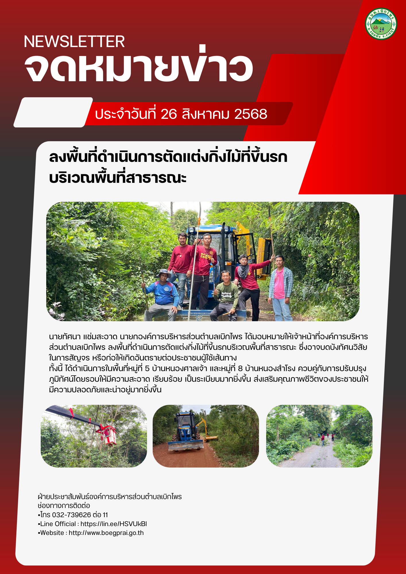 ลงพื้นที่ดำเนินการตัดแต่งกิ่งไม้ที่ขึ้นรกบริเวณพื้นที่สาธารณะหมู่ที่ 5 บ้านหนองศาลเจ้า และหมู่ที่ 8 บ้านหนองสำโรง